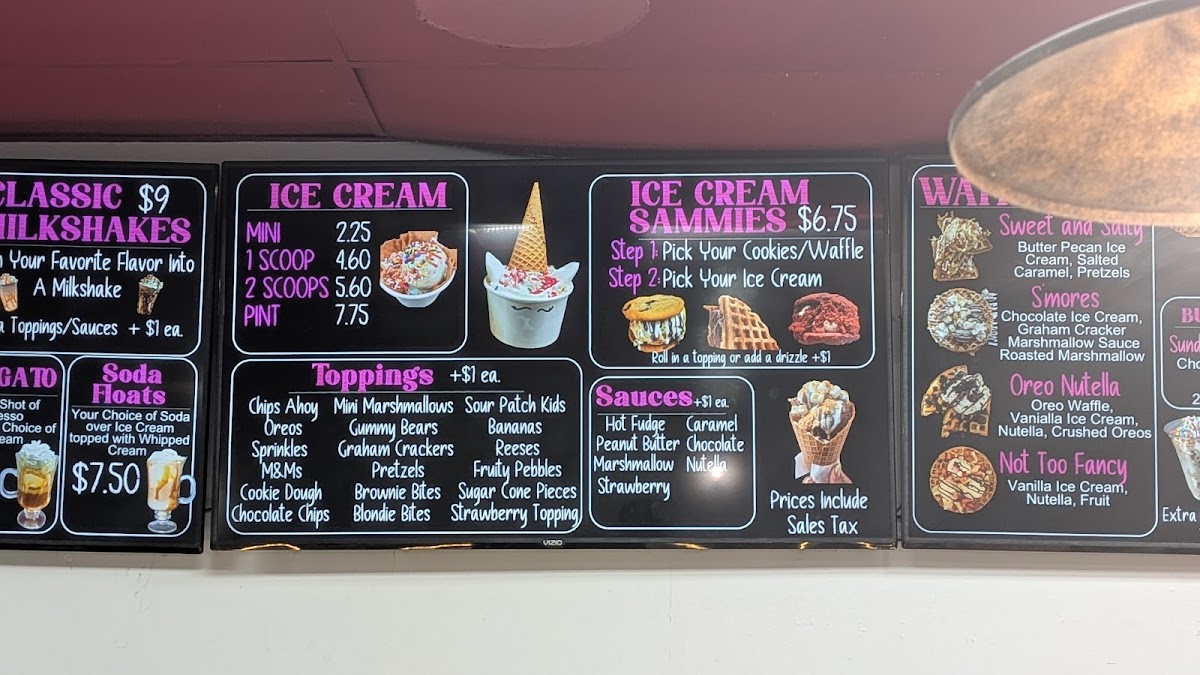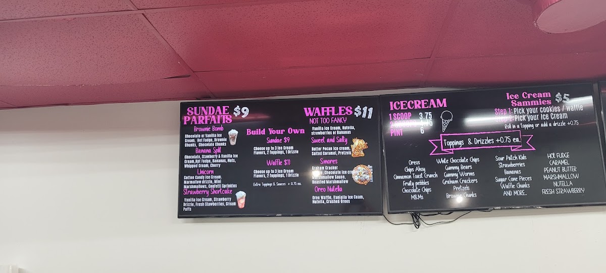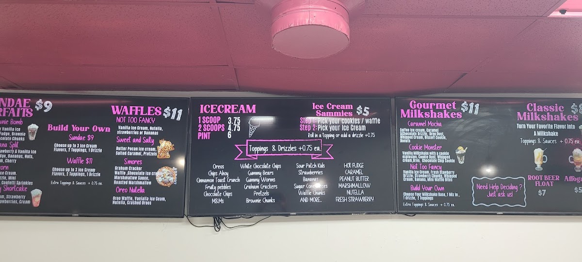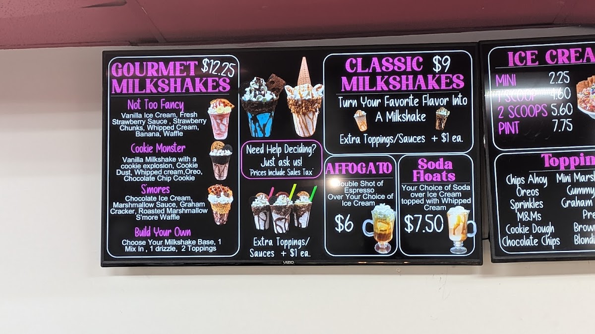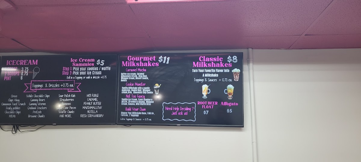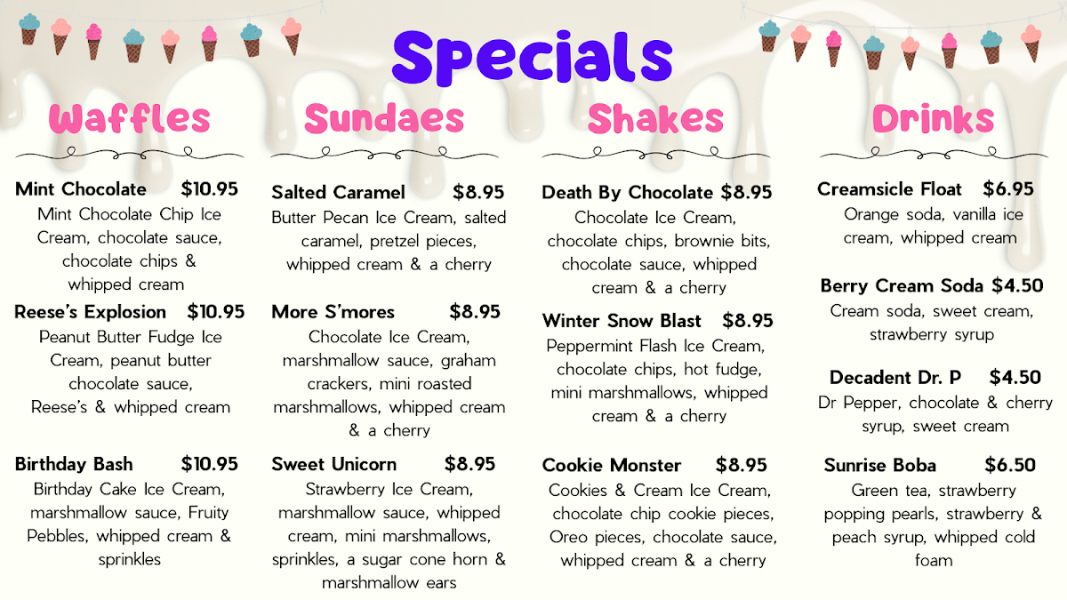 Any flavor ice cream, 1 mix in, 1 topping, 1 drizzle, whipped cream & a cherry. Add extra mix ins, toppings, or drizzle for $1 each