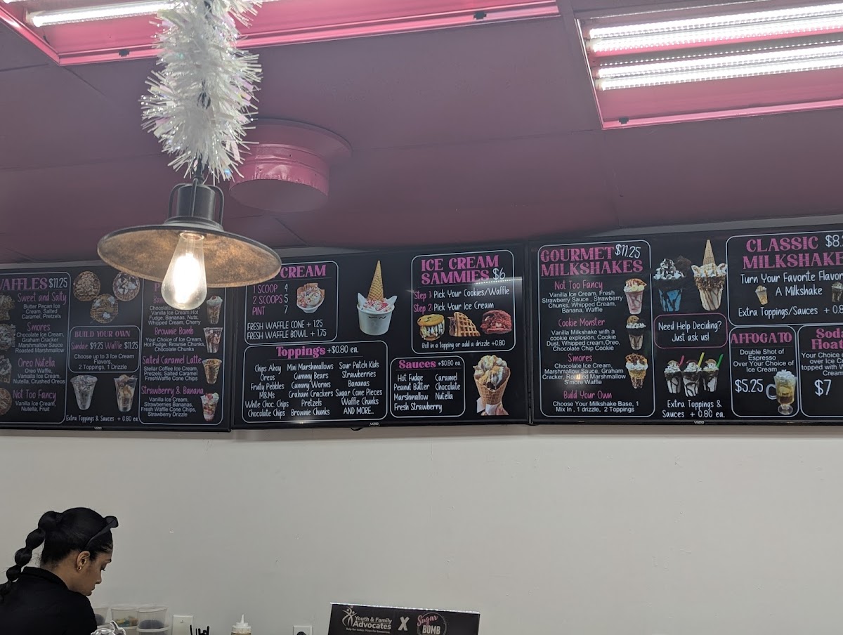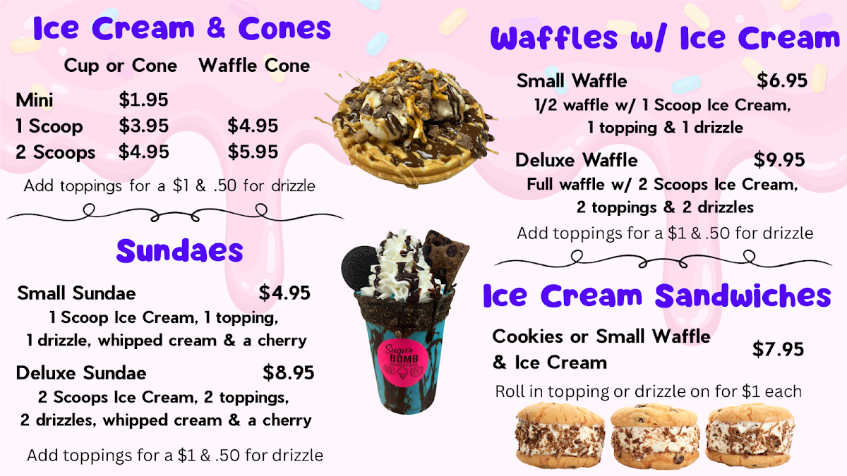 Wrapping up a visit to Sugar Bomb Dessert Bar at 7200 Ridge Rd STE 13, Port Richey, FL, the menu impresses with its playful creativity and indulgent variety. For waffle lovers, options like Mint Chocolate, Reese's Explosion, and Birthday Bash promise rich, sweet satisfaction, while the Small Waffle and Deluxe Waffle paired with ice cream elevate the treat even further. Sundaes are equally tempting, from Salted Caramel to the whimsical Sweet Unicorn, with both Small Sundae and Deluxe Sundae sizes available to match your appetite. Shake enthusiasts can dive into decadent flavors such as Death By Chocolate, Winter Snow Blast, or the iconic Cookie Monster, available as both Classic Shake and Deluxe Shake. The drink selection adds fun twists with offerings like Creamsicle Float, Berry Cream Soda, Decadent Dr. P, and Sunrise Boba, while inventive Dirty Sodas allow for customizable combinations of soda, milk, and flavor. Traditional boba and coffee options, including Green Tea, Black Tea, Milk Tea, and Cold Brew, cater to caffeine cravings, and the ice cream and cone choices-from Mini to 2 Scoops in a Waffle Cone-make portioning delightfully flexible. For on-the-go sweetness, Ice Cream Sandwiches with cookies or small waffles provide a handheld indulgence. Overall, the menu balances classic dessert staples with playful, Instagram-worthy creations, making Sugar Bomb a must-visit destination for anyone seeking both variety and decadence in every bite.