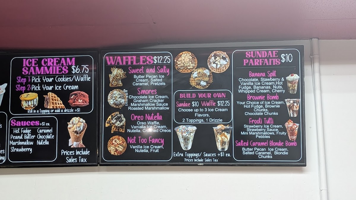 Full waffle w/ 2 Scoops Ice Cream, 2 toppings & 2 drizzles. Add toppings for a $1 & .50 for drizzle
